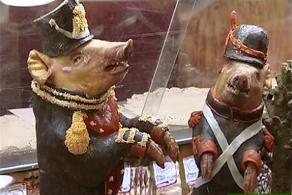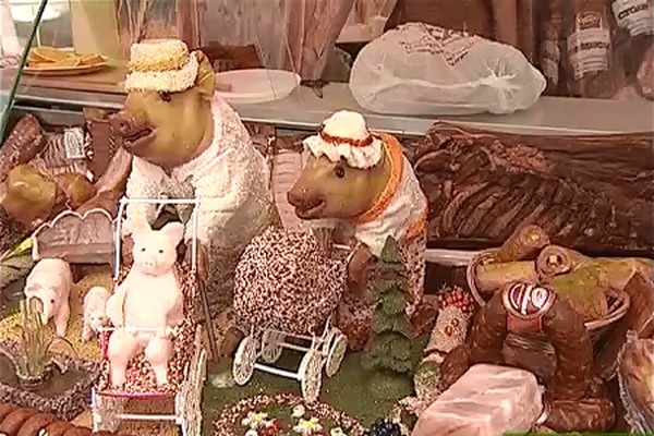На ежегодном празднике торговли, именуемом "Свенская ярмарка" в г. Брянске производители из ООО "Царь-мясо" нарядили свою продукцию — а именно: трёх копчёных поросят — в форму советских партизан.